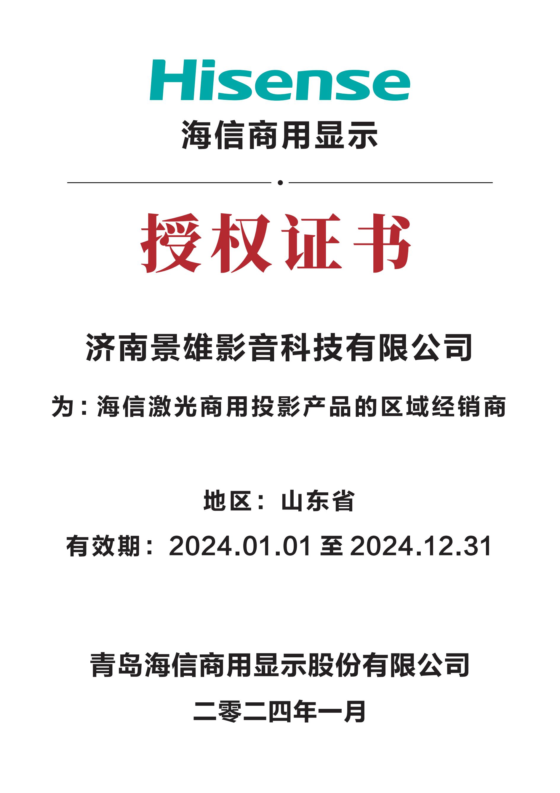 海信激光電視授權書